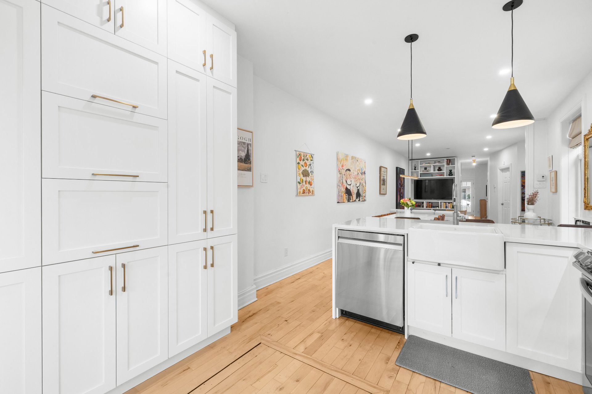 Lave-vaisselle. Tous les luminaires sauf ceux dans les exclusions. Tous les stores et rideaux sauf ceux dans les exclusions. Crochets à manteaux sur le mur du hall d'entrée. Bibliothèque encastrée / meuble télé (faite sur mesure par un ébéniste) dans le salon.